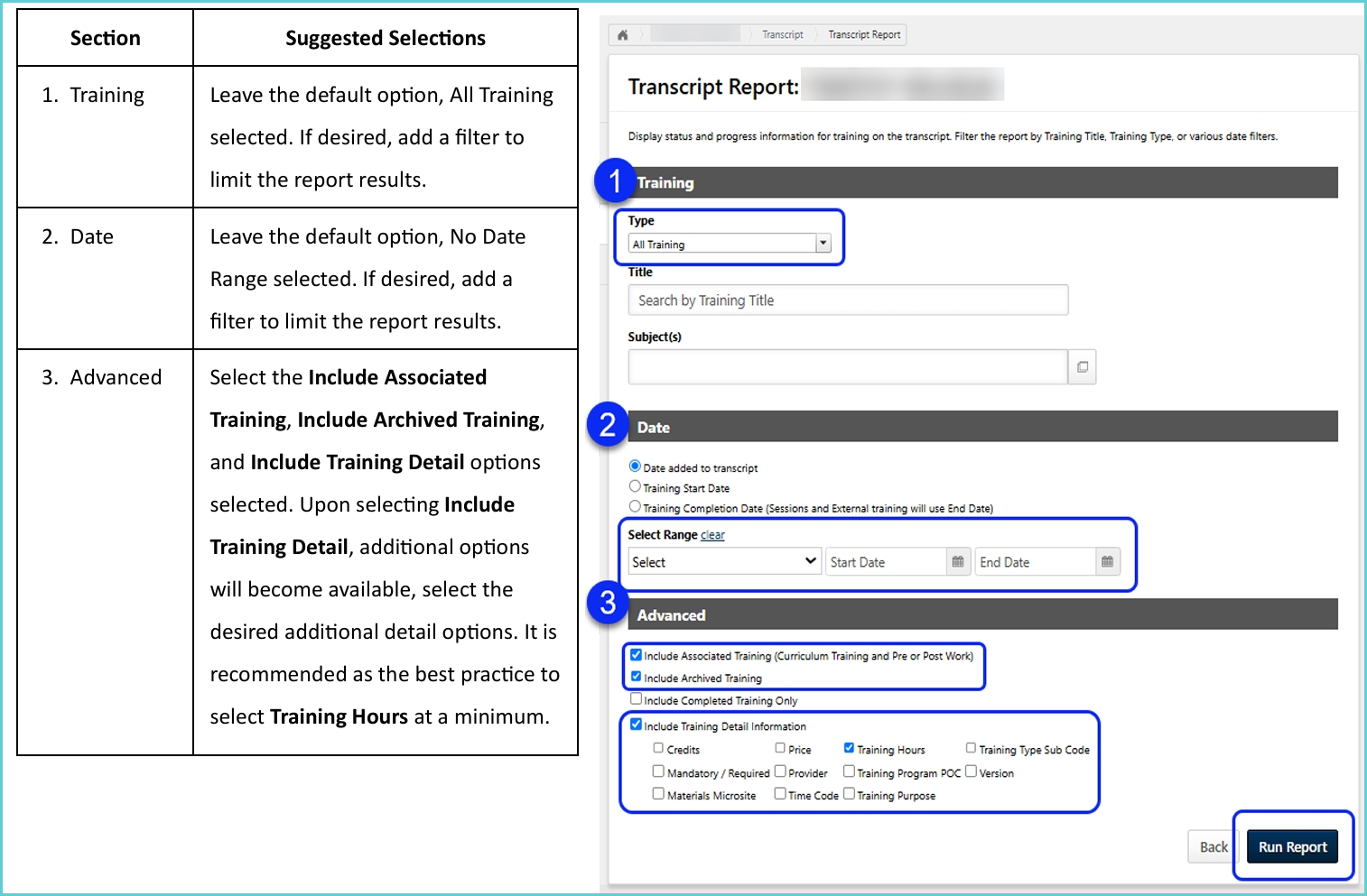 4. Select your desired reporting options. To obtain a full download of all trainings included on your CLC transcript, refer to the table and screenshot below for recommended reporting selections.